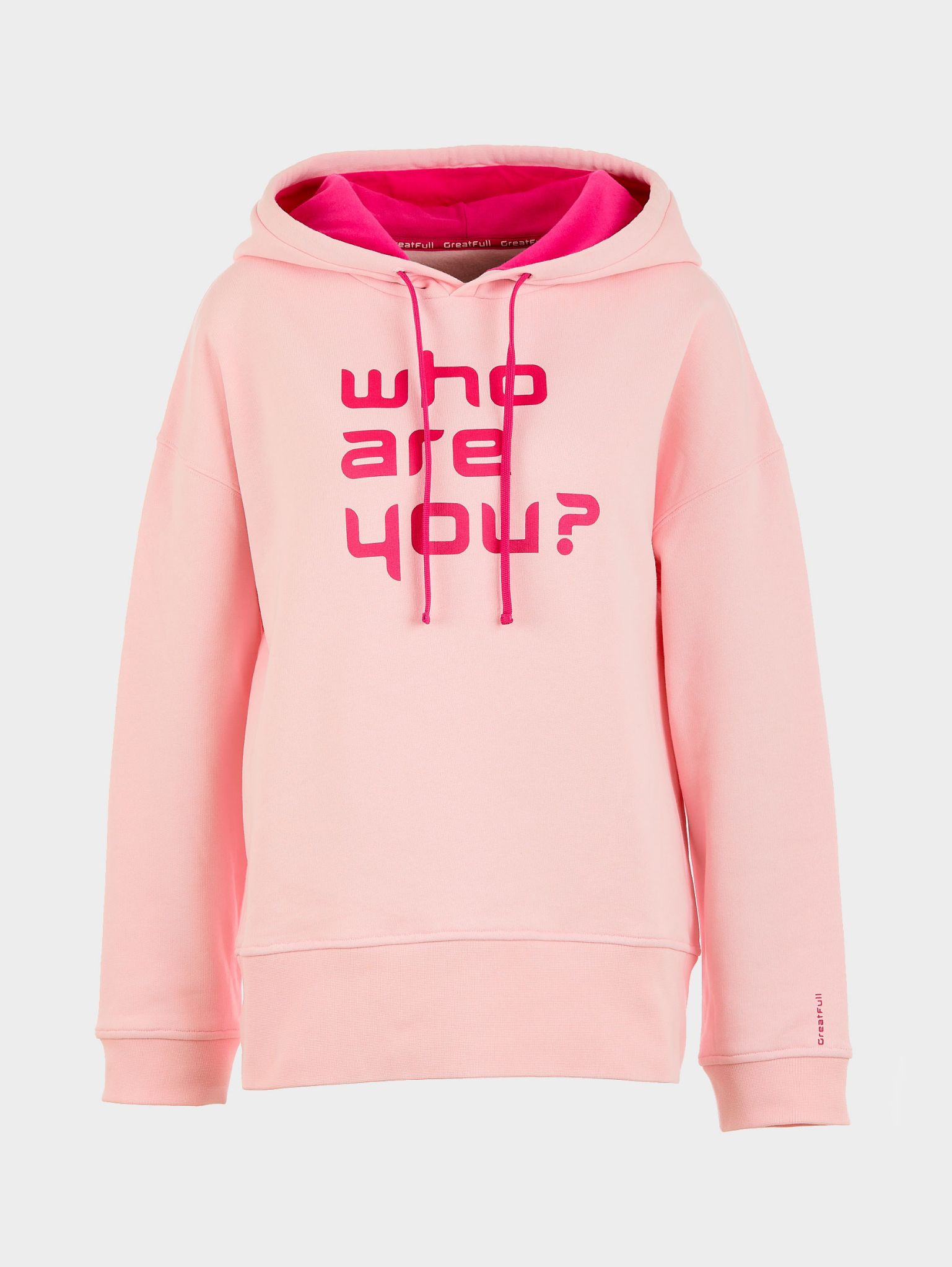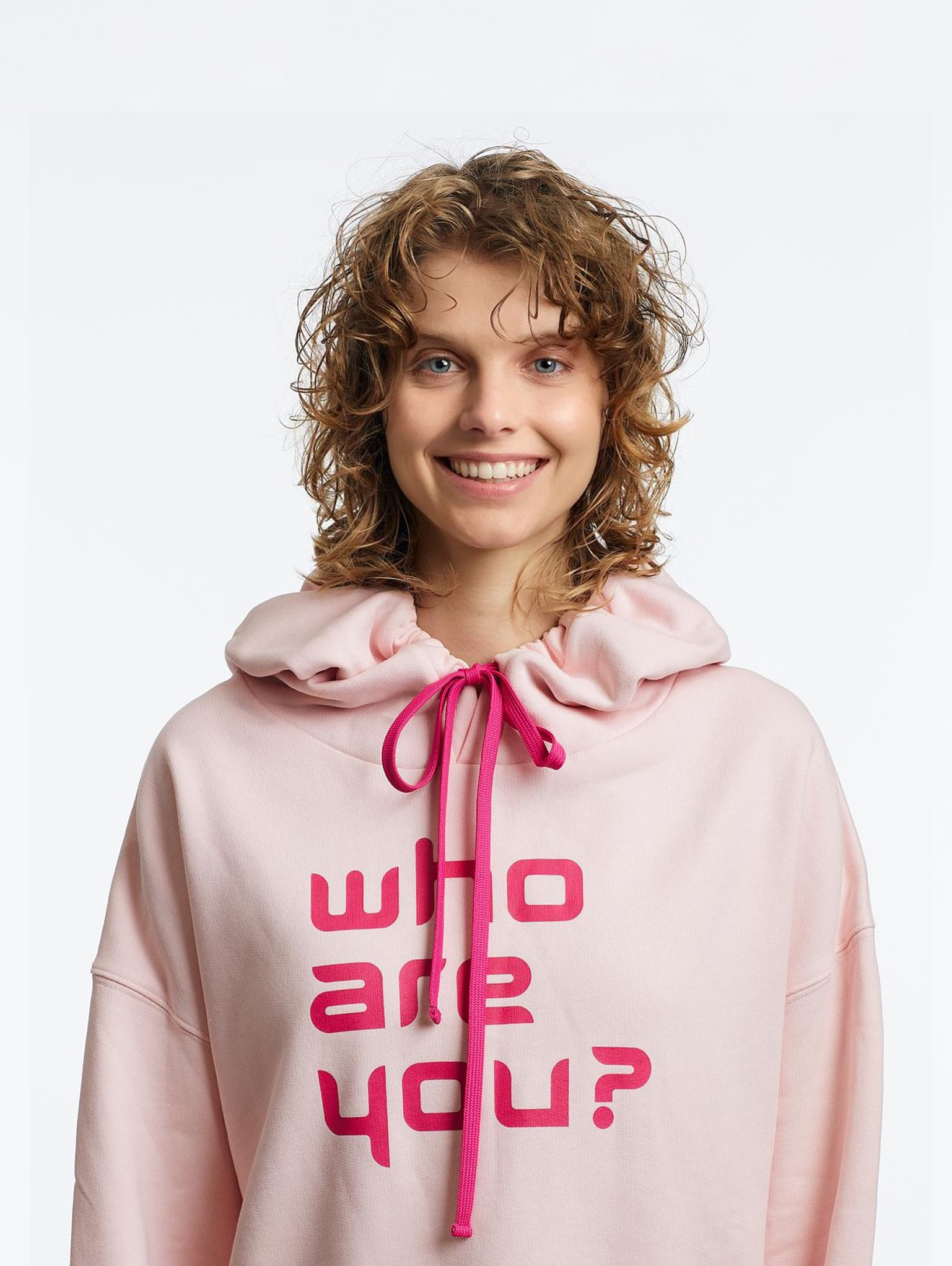 Pale pink and fuchsia sweatshirt with large jersey-lined hood and raglan sleeves 100% organic cotton from Turkey, weight: 340g Silk-screen print of the phrase “Who are you?” with the character Pi on the back created by artist Tom Tirabosco Designed in Switzerland, handmade in Italy GOTS certified By purchasing this product, you will be donating CHF 15.90 to the cause. Thank you so much!