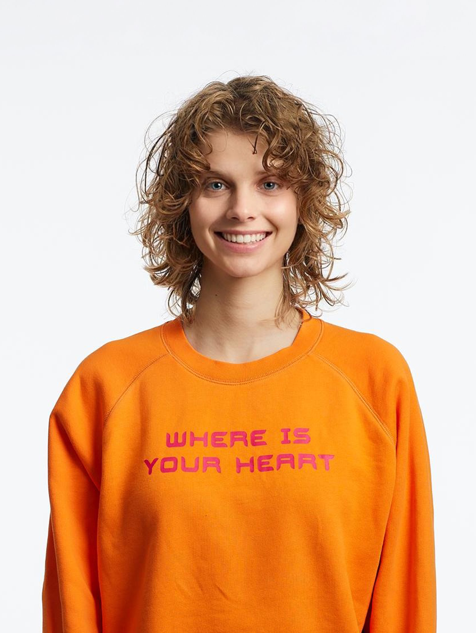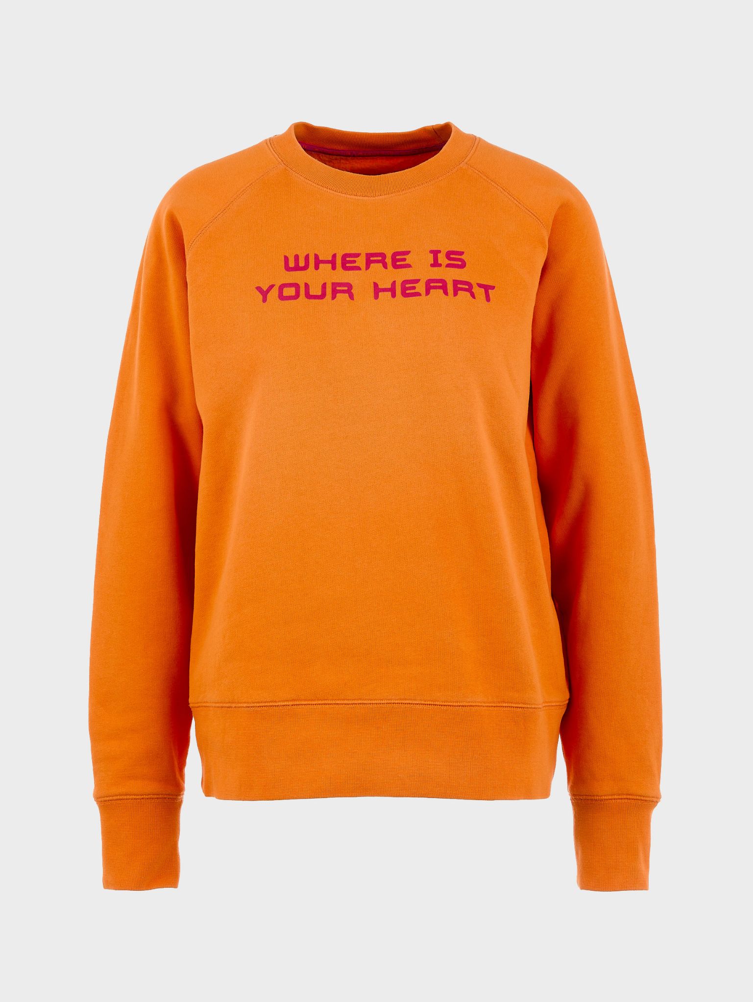 Orange and fuchsia regular sweatshirt, raglan sleeves 100% organic Turkish cotton, weight: 340g Silk-screen printing of the phrase “Where is your heart? the character Pi on the back created by artist Tom Tirabosco Designed in Switzerland and handmade in Italy GOTS certified By purchasing this product, you will be donating CHF 13.90 to the cause. Thank you so much!